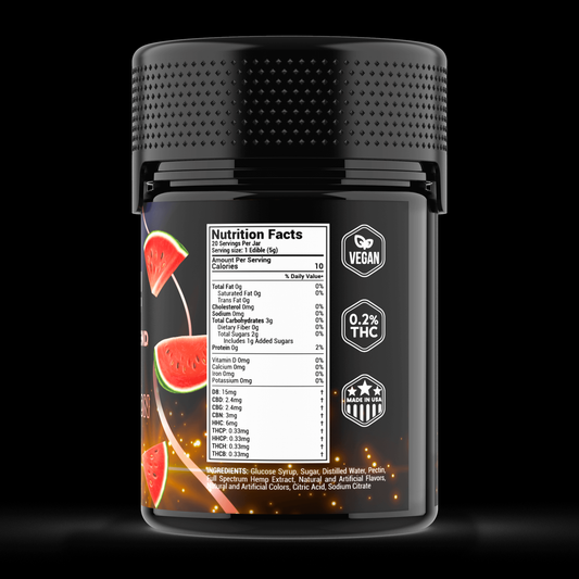 These Delta 9 gummies are infused with a premium Live Resin Full Spectrum mix of Delta 9, other powerful hemp compounds and beneficial terpenes to give a well-rounded and powerful effect.